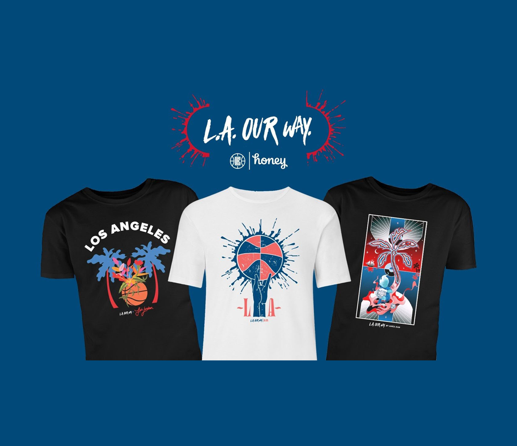 During the 2019–20 NBA season, the LA Clippers partnered with Honey on a multi-level campaign commissioning three emerging Los Angeles artists to design limited-edition t-shirts. Released during a Clippers vs. Lakers matchup and promoted through Instagram and Twitter giveaways that I managed, the campaign earned a Webby Award Honoree for Promotions & Contests (2021) and drove a 40% increase in impressions.